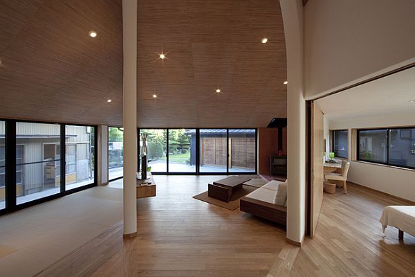 Our friends at Decoist have showcased a beautiful, modern home, with a pinch of traditional Japanese influences. Inspired by the former traditional Japanese house that used to rise in the middle of the uncommonly shaped lot, the T House generously uses the available space to the maximum. Designed by Kazuya Morita Architecture Studio, the distorted pentagonal structure is located in Tsushima City, a small village in the vicinity of Nagoya, Japan. The young couple residing here wanted a modern home with comfortable features that would remind them of their Japanese heritage without having to give up space or aesthetics. Five main structural walls separate the indoor living areas under an uncommonly shaped roof. A dome-shaped ceiling, dressed in wood, covers the bright interiors. Natural light coming from every angle is ensured by the large windows. Japanese white plaster was used to create the round corners seen around the house and all the interiors use traditional wooden construction methods. The fortunate combination between old and new has left this particular residence with a gorgeous interior design, while the exterior respectfully blends in with the neighborhood.